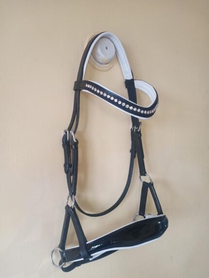 Be the first to review “Dressage Bridle V shap Browband Silver Chain White Padding Black leather With Reins” Cancel reply